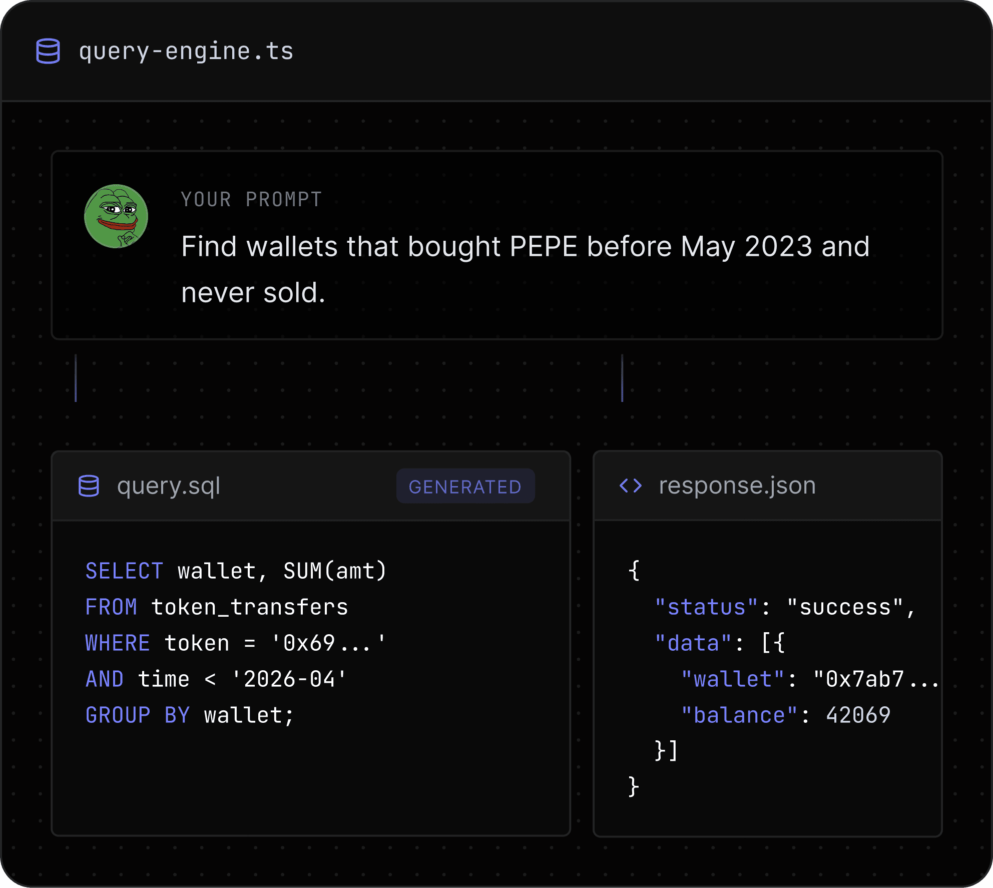 Translate natural language intents into deterministic SQL and GraphQL queries. Get 100% accurate, verifiable on-chain data delivered instantly in clean JSON.